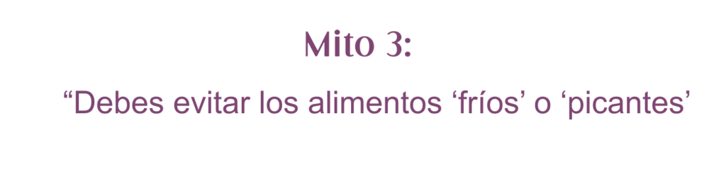 ❌ Las restricciones de temperatura o sabor son creencias culturales sin fundamento médico. Cada madre puede identificar si algún alimento causa malestar, pero en general no hay alimentos prohibidos.
